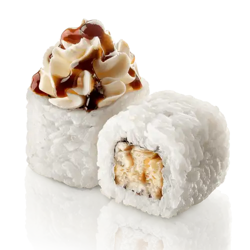 Угорь, тамаго, сливочный сыр, соус унаги, нори, рис заправленный