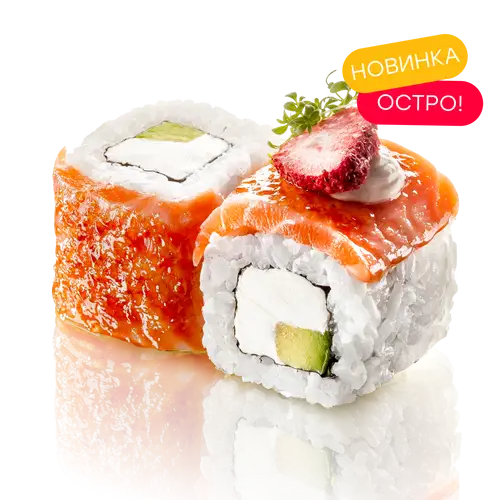 Лосось, сливочный сыр, клубника дегидрированная, авокадо, соус спайс, сахар тростниковый, микрозелень, нори, рис заправленный