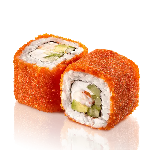 Тигровая креветка, сливочный сыр, авокадо, огурец, икра тобико, нори, рис заправленный