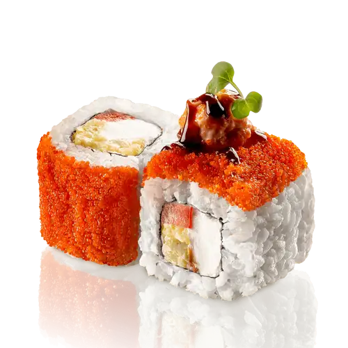 Тигровая креветка, сливочный сыр, икра тобико, томат, омлет тамаго, микрозелень, соус масаго, соус унаги, нори, рис заправленный