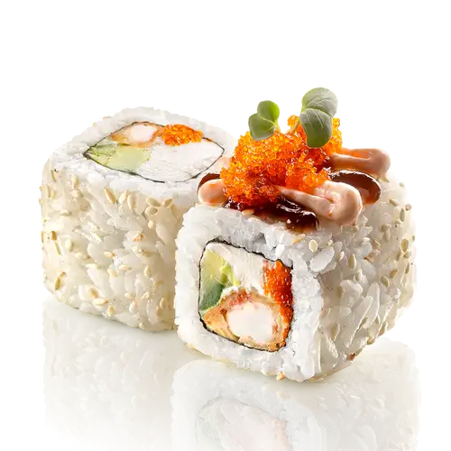 Тигровая креветка темпура, сливочный сыр, икра тобико, авокадо, микрозелень, кунжут, соус масаго (майонез, масаго оранжевая), соус унаги, нори, рис заправленный