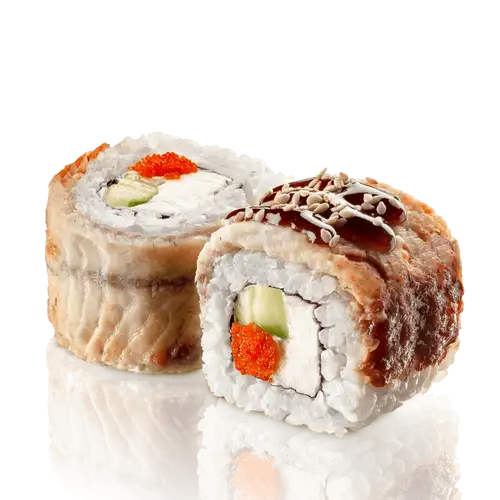 Угорь, сливочный сыр, огурец, икра тобико, соус унаги, кунжут, нори, рис заправленный