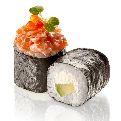 Лосось, сливочный сыр, авокадо, красная икра, соус масаго, микрозелень, нори, рис заправленный