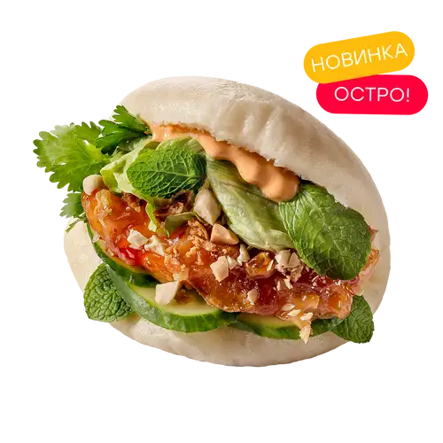 Паровая булочка бао, курица в темпуре, огурец, салат айсберг, лук фри, молотый арахис, мята, кинза, соус сладкий чили, соус азиан