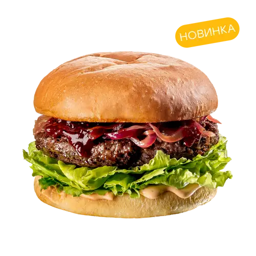 Булочка бриошь, котлета из мраморной говядины, салат айсберг, карамельный лук, соус ягодный барбекю, соус бургер