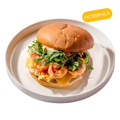 Булочка бриошь, тигровая креветка, скрэмбл, сыр, микс салат, соус трюфельный, соус спайси