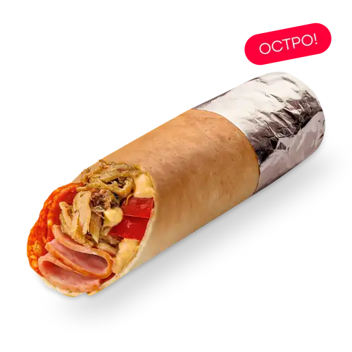 Копчёная рваная свинина, ветчина, чоризо, моцарелла, томаты, маринованные огурцы, соус гриль, соус барбекю
