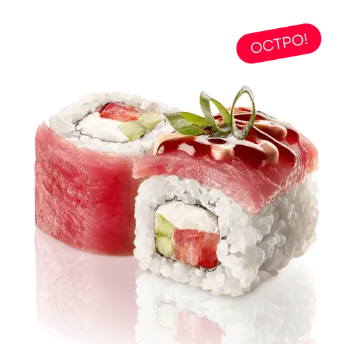 Тунец, сливочный сыр, помидор, огурец, зеленый лук, соус унаги, соус спайс, нори, рис заправленный
