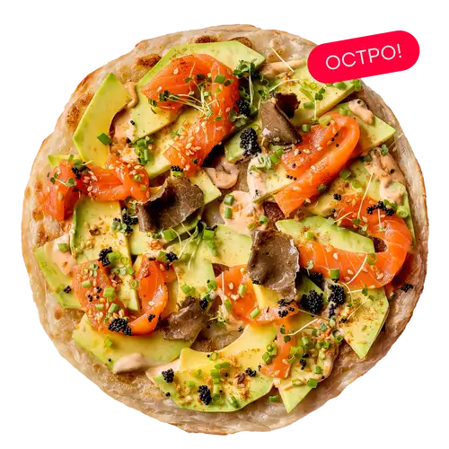 Лепешка роти, лосось, авокадо, моцарелла, пармезан, черный трюфель, соус трюфельный, соус спайси, зеленый лук, авторский кунжут кимчи, икра тобико, микрозелень