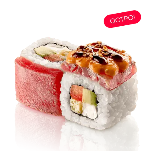 Опаленный тунец, сливочный сыр, авокадо, томат, омлет тамаго, авторский кунжут кимчи, соус спайси, соус унаги, нори, рис заправленный