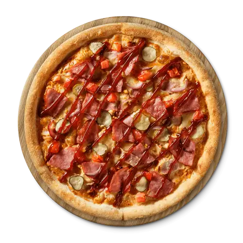 Соус гриль, моцарелла, томаты, маринованные огурцы, красный лук, бекон, ветчина, соус барбекю