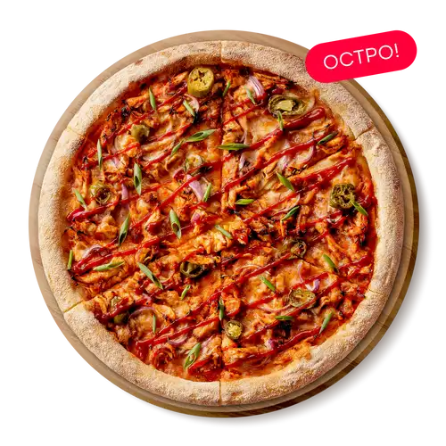 Томатный соус, куриное филе, моцарелла, красный лук, зеленый лук, соус баффало, соус шрирача, халапеньо