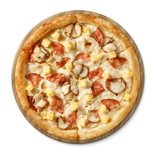 Соус альфредо, куриное филе, ветчина, моцарелла, ананасы