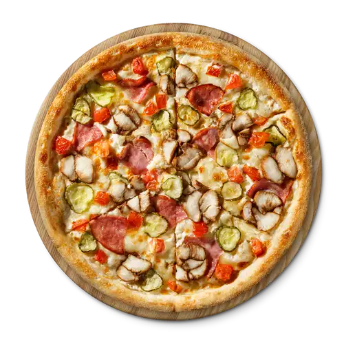 Сливочный соус, ветчина, куриное филе, томаты, маринованые огурцы, моцарелла