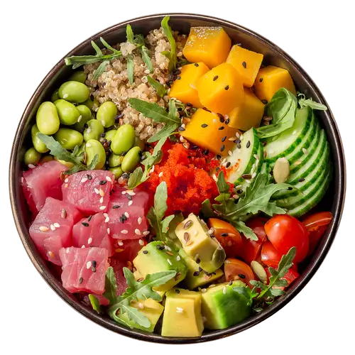 Тунец, салат микс, киноа, бобы эдамаме, огурец, манго, томаты черри, авокадо, масаго, смесь семян, кунжут