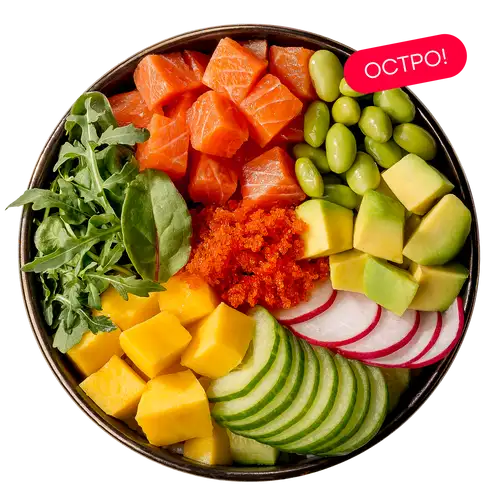 Лосось, рис, бобы эдамаме, огурец, редис, манго, авокадо, масаго, кунжут, салат микс, соус ореховый, соус спайс нью, соус никкей