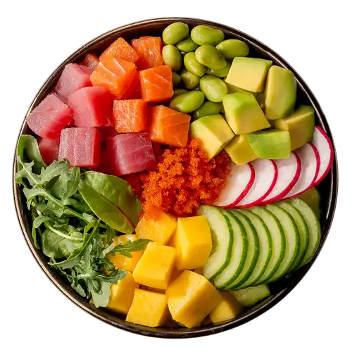 Лосось и тунец, рис, бобы эдамаме, огурец, редис, манго, авокадо, масаго, кунжут, салат микс, соус ореховый, соус маракуйя, соус понзу