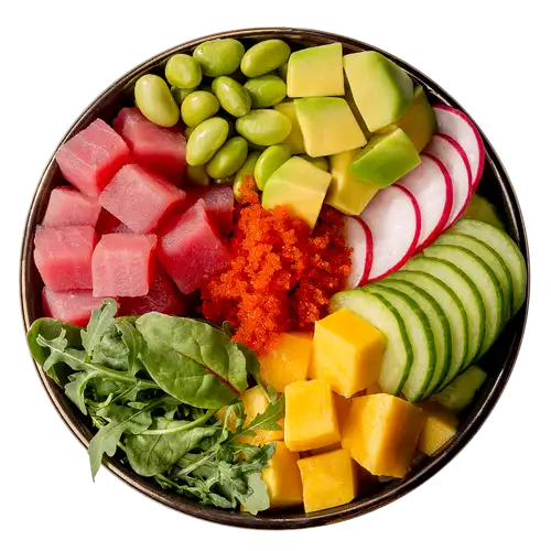 Тунец, рис, бобы эдамаме, огурец, редис, манго, авокадо, икра тобико, салат микс, кунжут, соус маракуйя, соус понзу, ореховый соус