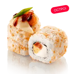 Угорь, тигровая креветка, два вида сыра, икра тобико, майонез, соус унаги, нори, рис заправленный