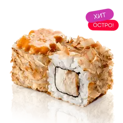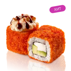 Курица, сливочный сыр, грибы шиитаке, икра тобико, майонез, фирменный соус том ям, кинза, сухари панко, кляр, нори, рис заправленный