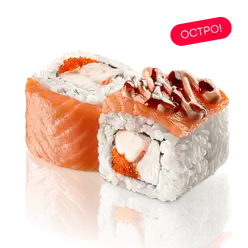 Лосось, сливочный сыр, икра тобико, авокадо, фунчоза фри, соус масаго (майонез, масаго оранжевая), соус спайси, нори, рис заправленный