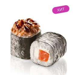 Лосось, тигровая креветка, сливочный сыр, икра тобико, соус спайси, соус унаги, нори, рис заправленный