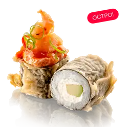Лосось, угорь, сливочный сыр, авокадо, зеленый лук, сухари панко, нори, кляр, рис заправленный