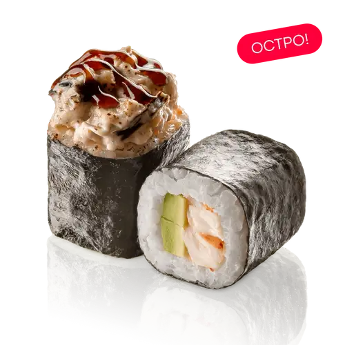 Тигровая креветка, мидии, сливочный сыр, авокадо, соус спайси, соус унаги, нори, рис заправленный