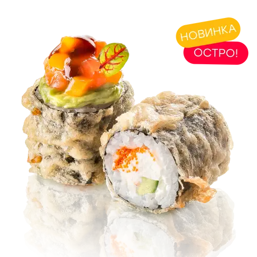 Лосось, сливочный сыр, манго, огурец, соус гуакамоле, соус унаги, соус манго-чили, соус шрирача, икра тобико, кляр, нори, рис заправленный
