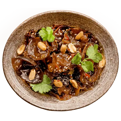 Пикантная закуска из древесных грибов в фирменном азиатском маринаде с кинзой, хрустящим арахисом и кунжутом