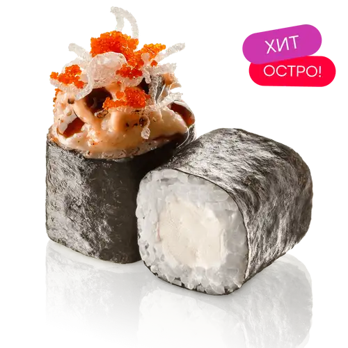 Тигровая креветка, сливочный сыр, икра тобико, фунчоза фри, майонез, соус спайси, соус унаги, нори, рис заправленный
