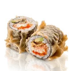Курица, сливочный сыр, грибы шиитаке, икра тобико, майонез, фирменный соус том ям, кинза, сухари панко, кляр, нори, рис заправленный